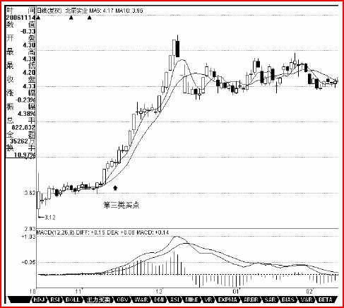 例如,工商银行在 12月14日构成典型的日线级别第三类买点;北辰实业在11月14日构成典型的日线级别第三类买点;000803在1月20日构成典型的日线级别第三类卖点。注意,第三类买卖点比第一、二类要后知后觉,但如果抓得好,往往不用浪费盘整的时间,比较适合短线技术较好的资金,但一定要注意,并不是任何回调回抽都是第三类买卖点,必须是第一次。而且,第三类买卖点后,并不必然是趋势,也有进入更大级别盘整的可能,但这种买卖之所以必然赢利,就是因为即使是盘整,也会有高点出现。操作策略很简单,一旦不能出现趋势,一定要在盘整的高点出掉,这和第一、二类买点的策略是一样的。