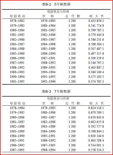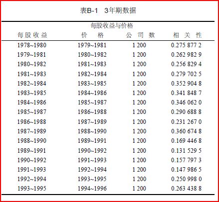 例如,表B-1表现了3年期收益与价格的关系。如果我们将这1200家公司在1978 ~ 1980年间的每股收益与同期的价格变化相比较,会发现二者间的相关性很弱为:0.275。这意味着价格变异的27%是由收益变异引起的。