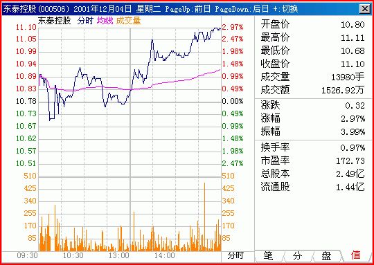例如,2001年11月27日的龙涤股份(000832)就属于拉升吸货,该股经历了前期长时间的下跌后,股价最大跌幅达到50%,对于大量高位持有股票的人来说,有较强的自救需要,但自救之前,首先要在底位回补,即摊平成本的筹码再次收集,当天的分时走势中,股价一路震荡向上,小幅上涨,从股价不急不躁的上涨中,可以发现主力的目的并非是推高股价。盘口交易中,主力有意摆放了许多大单,有时在卖盘连续挂单,有时在买盘挂,有时则是买卖盘同时挂单,盘中交易连续,但成交手笔并不规则,在缓慢的拉升中明显有种较坚决的买入力量,而盘口的反复活跃的变动,反映出主力较迫切的操盘心理。