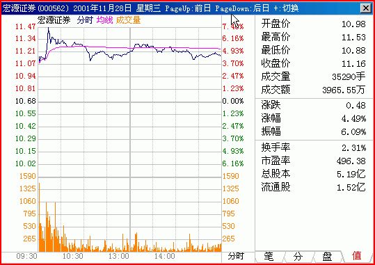 例如,2001年11月28日的宏源证券(000562)没有准备的高开。中国证监会在前一天宣布,决定调整证券公司增资扩股的现行政策,凡依法设立的证券公司均可自主决定是否增资扩股,证监会不再对证券公司增资扩股设置先决条件,这一新政策对证券公司增资扩股,放宽了条件,简化了程序,对券商来说是重大利好,宏源证券(000562)属标准的券商概念股,于是当天开盘该股在此利好的影响下,高开3%左右,集合竞价撮和量有十万多股,与前一天全天成交不足五十万股比,属明显放大,之后股价出现急速的拉升,但成交量始终没有有效放大,股价最终冲高回落。根据以上的分析,这种现象属于主力并不想借机拉升的走势,由此判断股价的后市走势,可能还会有较长时间的震荡整理,而且当天的上涨不能与主力的步伐协调,整理的时间会比正常情况下延长。