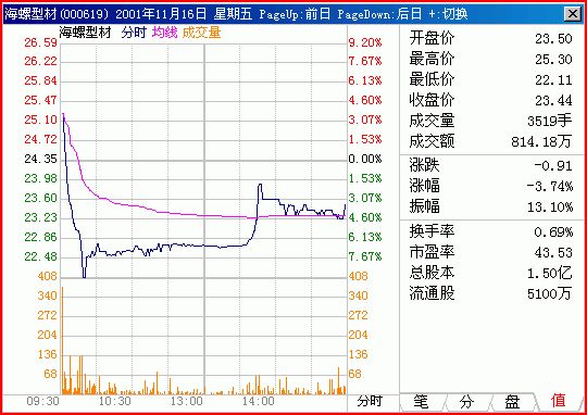 例如2001年11月15日跌停的海螺型材(000619),这只股票也是控盘程度很高的一只庄股,在前期大盘下跌了几个月中,该股没有受到任何不良影响,甚至股价还出现了略微的重心上移,市场筹码的高度集中是显而易见的,当日该股像往常一样平静的开盘,之后缩量整理,但市场再也无法用他的耐心和精力维持以往看起来很容易的盘局,股价一点点滑落,没有什么特别,而且单从分时走势看,股价的跌幅也并不强烈,并非是那种轰轰烈烈的大跌势,就是这么自然而然的下跌,就是这么简简单单的跌停,盘中没有任何抵抗,也没有什么异常迹象,股价就在平静中进行着交易。从这种毫不抗跌的走势中,我们看到三点问题,第一,跌停本身是有备而来,市场用最迟钝的走势说明了股价中散户参与数量的稀少;第二,主力小心翼翼,让跌停并不起眼,说明主力尽可能在让减仓盘出局;第三,分时走势非常平淡,跌停本是股价最大风险的体现,没有理由如此若无其事,原因只是因为存在某种很自然的掩盖风险的力量。基于这三点的分析,可以判断这只股票,主力持仓很重,在这个点位继续维持盘局已没有太大意义,主力虽然急于出货,但必须要不动声色等待以后的机会,否则可能更惨。