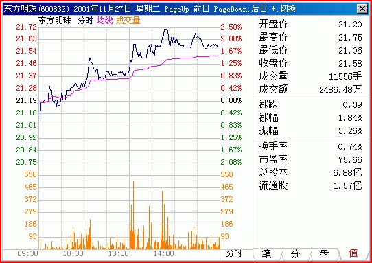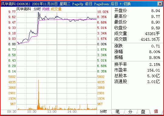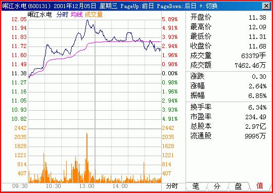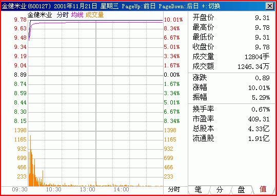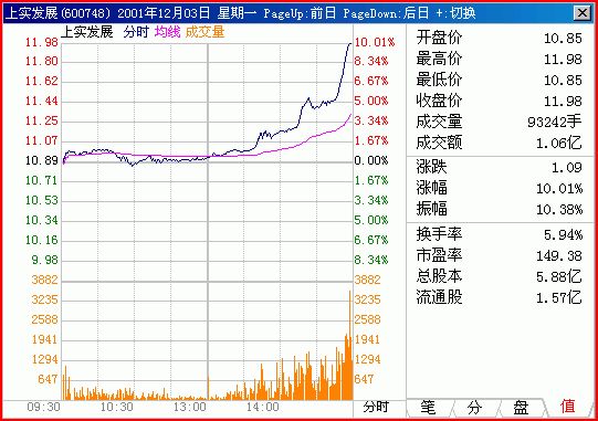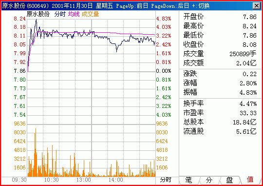 例如,2001年11月30日的原水股份(600649),该股开盘后持续放量走高,连续出现每笔几十万股的交易,该股在基本面平静的情况下,突然放量让人不解,从盘口交易看,很难是普通散户所为,而这种快速放量急升的手法也不是有人想要吸货,再看日k线组合,前一交易日成交不足200万股,今天突然放到2500万股,在没有任何原因的情况下,抛盘和买盘的突然增加是不可思议的,只有一种可能,深在其中的主力,为吸引市场的关注做出让人注目的走势,就这只个股而言,今天的量不是吸货,对于这种盘很大的股票来说,拉高吸货是不可能的,因为有更好的机会逢低吸纳,那么只有两种可能,第一,有人迫切离场;第二,有人想用这种走势吸引人关注,在日后的走势中派发离场。