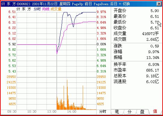 比如东方电子(000682),股价从24元多一路跌到4元多,在这么一段长长的下跌过程中,该抛的早就抛了,没有人看到4、5元的低价还会再抛,相对而言6元也是非常低的价格,一样不会再想割肉求生了,所以在这种极低的价格区间,如果股价反弹,并不会有抛盘的,这是一种合理的市场情况,那么东方电子(000682)在去年11月放量的上攻,卖出的量只可能是自己的,当然最初买入的量也是自己的,分时走势中我们可以非常清楚的看到这种不合情理的有规律的交易,比如2001年11月22日,该股上午停牌,下午复牌后,股价一口气到涨停板,只有一种可能会走出这种走势,就是市场没有人抛售,这是一段没有抛盘的拉升。为什么会这样,解释只能是主力通过这种强烈的上涨势头吸引市场永远存在的投机客而出货,而东方电子跌到几元后仍有人出货,综合分析技术面,这是完全成立的。