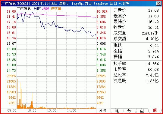例如,在2001年11月16日证券(股票)交易印花税税率下调至2‰的利好影响下,沪深股指出现大幅的高开,不少股票以涨停板的价格开盘,但之后大多数股票走出全天性的震荡回落。这种突发性的因素影响下,市场反应各异,有些会在高位匆忙抡进,有些坚决派发,以广电信息(600637)为例,让我们分析一下在涨停板处市场不同投资者对股价后市的不同判断。该股在2001年11月16日时以涨停板的价格开盘,同时伴随巨量成交,但涨停板很快被打开,仍是大单以很大的密度集中成交,之后又在更大的成交量的配合下股价再次封到涨停板,这时股价在持续大量的推进下,抛压不但没有减轻,反而喷涌而出,很快涨停板在成交量持续放大下再次打开,如此这般又有一次涨停、打开的过程,最终放弃上试涨停板的走势,股价震荡回落以接近全日最低点收盘。从日k线上巨大的成交量和光头的大阴线可以明了,主力已完成了相当大量的筹码的派发,再回过来分析分时走势时股价在涨停板处反复的表现,可以判断,涨停板处的高频率的交易和高比例换手是主力利用利好,在最短的时间里积极吸引市场投资者盲目参与的结果。从这段走势中我们可以看到主力出货的技巧,利用人们在股价上涨时必然的欣喜的情绪,反复震荡,打乱投资者正常的思路,让人们在又要涨停的短暂时间里,因为唯恐错过的心理吸引人们主动的在高位接货,相比在跌停板时的出货实在是成功得多也容易得多。