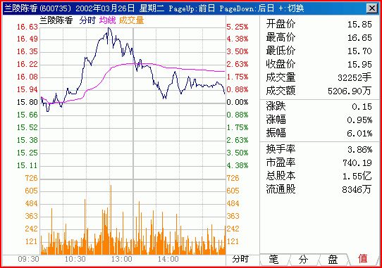 具体到盘面的细节上,其手法更是有根可循,继续以兰陵陈香(600735)为例,近期该股已出现连续的阳线的走势,在k线图上呈现出极其强劲的升势,而在分时走势图上,该股的点滴走势都反应出想要出货的市场特征,不过这也是类似个股采用类似手法出货的较普遍特征。首先,股价上涨的过程是缓慢推升的过程,很少或者不可能见到常见的强势股,价涨量增流畅上涨的过程,因为强庄股的抛盘是可测的基本恒定的,不像普通的股票抛压是递增的,其上涨过程是有规律的推升,在兰陵陈香(600735)2002年3月26日的分时走势中,股价在上档抛压均衡的情况下持续平稳的推进,充分显示出了强庄股的特点;其次,股价不轻易回调,经常会出现逆势盘整或上涨。在兰陵陈香(600735)近期拉升过程的分时走势中,这是一个重要的盘面特征,如果说前面的稳步的拉升过程只能反应出推高股价的意愿,那么这种抗跌则表现出想要变现筹码的意愿,试想如果不是出货,经过持续的拉升后,正常情况下应该是较强烈的回调洗盘,但股价并不情愿下跌,反而极力维持高价位,期间交易非常频繁,成交量的堆积较明显,加上拉升过程单纯的推高股价的目的,可想而知其变现的本质意图;第三,股价下跌时,跌速快同时又尽可能的迅速回抽,在分时走势上经常显示为锯齿型。这种走势的形成原因是,盘中筹码力图最大程度的在高位变现,一方面对买盘现有的挂单尽快抛售,另一方面又不希望这种卖出影响市场其它持有者的信心,于是就快速回抽护盘,但这种出货行为本身没有办法阻止股价的下跌,最终股价将会出现持续的盘跌行情,在兰陵陈香(600735)2002年3月26日的分时走势图这种行为极其明显。