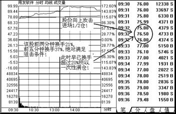 图 5 3. 股本最好不要大于 3 个亿。因为大盘股拉升的空间相对较小。 4. 到 9 : 31 结束,即前两分钟换手率要达到 10% 以上。至少不低于 9% ,且以后要 补 量。 当然,如果市场阶段性换手比较低的话,比如今年年初,可适当降低两个百分点。但不能再低于这个数值了,否则风险会大于利润。一旦满足条件,我们将把握机会 半 仓介入 ( 图6、图7)。