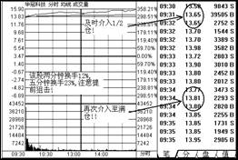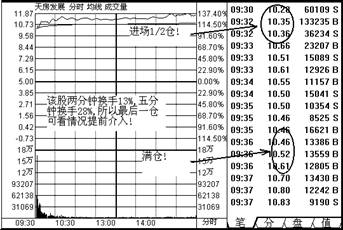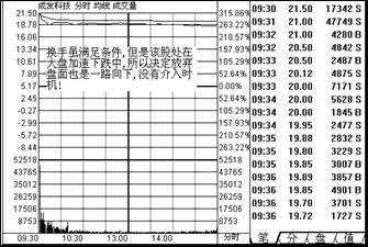 图 7 5 . 到 9 : 35 结束,即前五分钟换手要达到 20% ,特殊阶段也不能低于 18% 。若满足条件,我们要把握机会及时出击,满仓介入( 图 8、图9)。